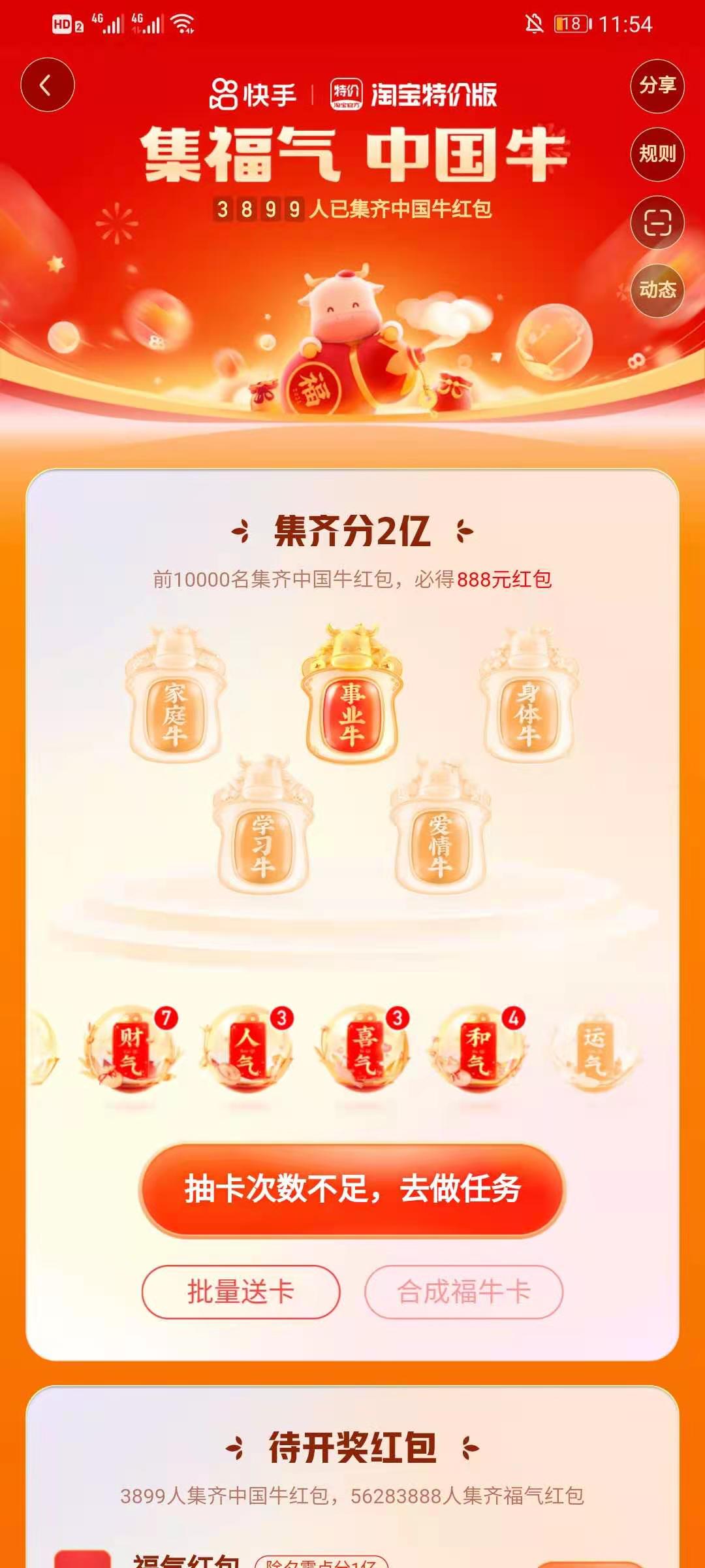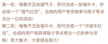 1、每集齐五张福气卡,即可合成一张福牛卡,并合成一个“福气红包”,每次想要合成福牛卡都需要五张福气卡,所以我们主要还是需要福气卡;