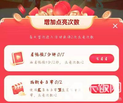 1)看视频:看5分钟视频,每观看5分钟视频可获得2次点亮机会,最多可获得10次;