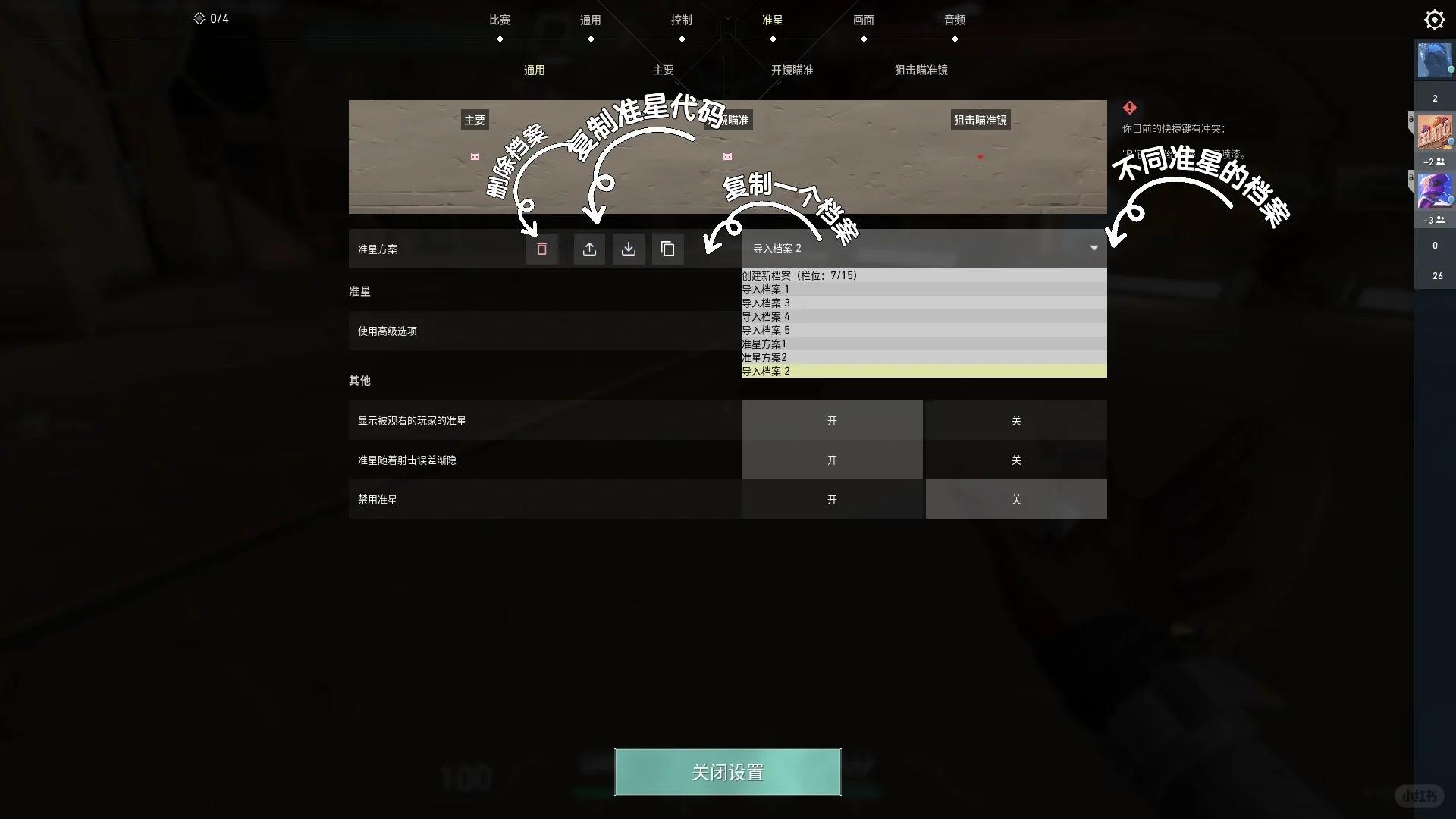 6、点击档案列表可以选择不同的准星档案,复制准星代码之后ctrl加v可以粘贴发送。