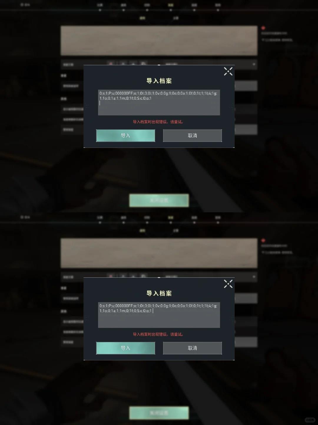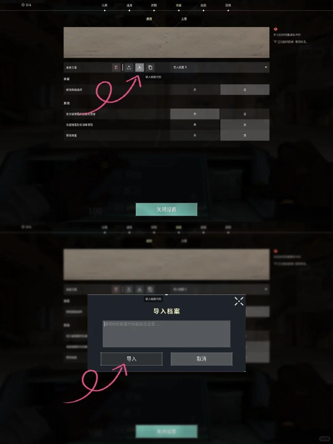 2、点击导入档案代码,鼠标左键点击箭头所指的地方,然后按下Ctrl V将复制的准星代码粘贴,然后点击导入。