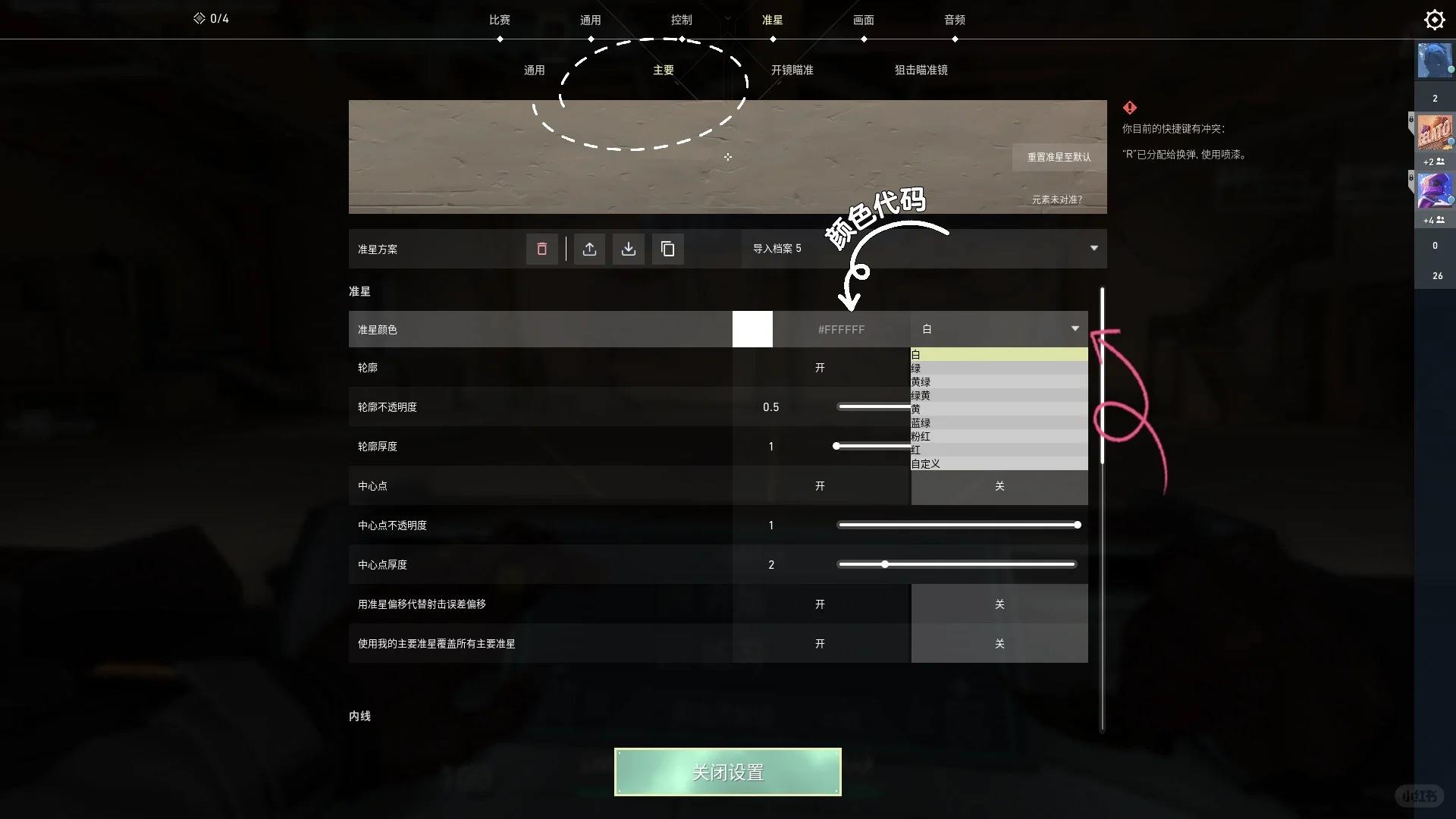 5、更改准星颜色,以更改主要准星颜色为例,点击上方的主要,然后点击右边后可以选择自己想要的颜色,也可以输入颜色代码更改系统自带没有的颜色。