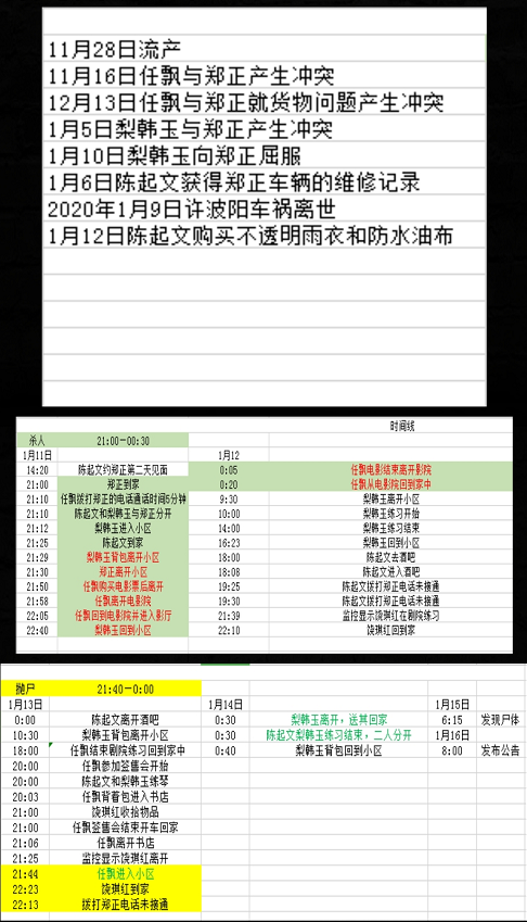 郑正在担任大学教授期间,利用职位之便猥亵女学生,并引诱她们染上毒品,随后用拍下不雅照片、视频、和毒品进行人身控制,梨韩玉便是其中一员。但梨韩玉长相姣好,专业技能过硬,于是郑正便将其带入乐团,并定期提供毒品将其“捆绑”在身边。梨韩玉虽然尝试过戒毒,但都以失败告终。在陈起文进入乐团后,梨韩玉便爱上了他,并发送了示爱的邮件给他。为了能与陈起文在一起,也为了摆脱郑正的控制,她开始计划偷取毒品。并不定期的跟踪郑正,找到了藏匿毒品的废旧房屋。案发当晚22:59,梨韩玉在陈起文离开后,背着包悄悄前往河边房屋,在鞋底留下了河边的泥土,虽然事后清洗了鞋子,但鞋缝中仍有未清理干净的泥土残留。随后梨韩玉在废弃房屋内,找到并拿走了两袋海洛因,随后回到了家中。其1月13日有不在场证明且无合作抛尸可能,故排除杀人嫌疑。根据嫌疑人社会关系及其他线索综合可知无合作杀人可能。任飘与郑正一直保持“合作关系”。但随着梨韩玉进入乐团,郑正为了能更好的控制她,便把第一小提琴手的位置给了梨韩玉,这引起了任飘的不满。不久后郑正发现了任飘送给饶琪红的琴谱(饶琪红并未作出回应),郑正便威胁任飘远离饶琪红。被激怒的任飘知道饶琪红常年遭受家暴,便有了杀死郑正,与饶琪红在一起生活的想法。11日晚上聚餐结束后,任飘伪造前往电影院观看电影的假象。并用摘下口罩帽子这一动作加深售票员的印象,随后说要下楼停车,在车中与雇佣的人互换,制造自己一直在看电影的假象,并在交换后步行离开停车场,打车前往河边。他以临时突发情况为由,约死者出来。并埋伏在树林中,伺机而动。但等了许久一直不见郑正前来,在拨打电话无果后,任飘决定暂缓计划。1月13日任飘收到带有交易信息的信纸,通过其中内容(1/13/20/00/H,xh)得知1月13日20:00在新华书店交易海洛因,在签售会结束后任飘回到废弃房屋内藏匿毒品,饶琪红也在任飘离开后,进入房屋内处理尸体。