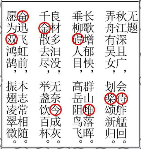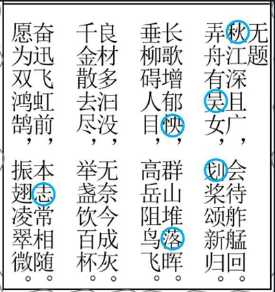 英=落 怏,吉=志 吴,利=秋 划。(在此题给出的诗中,汉字拆解组合只有唯一解。)