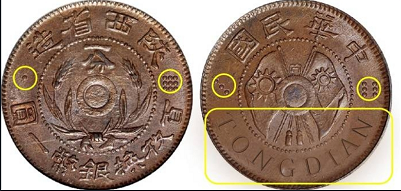 铜元上还有若干汉字信息,采用的也是定位法,只不过仅使用了行数和字数来定位。