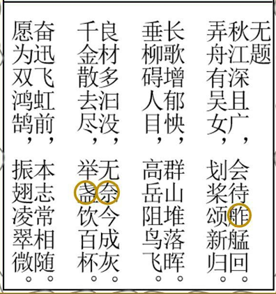 银票背面的三位数字,第一位代表诗句的段数,第二位代表段中的列数,第三位代表列中的字数。例:127代表第一段第二列第七个字,即“桨”。以此类推,最终可得到“桨”、“奋”、“今”、“金”、“双”、“堆”、“待”、“碍”这八个汉字。