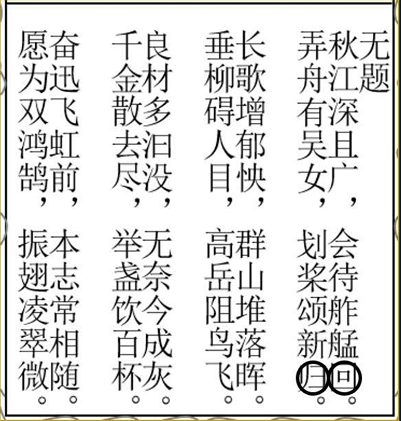 做到这一步时,我们已经用尽了现有的线索。结合前几关的解密,我们此时应该尝试使用第一关的定位法。经过反复阅读第一关的诗句,我们可以发现,其实每一列的诗句是含有十个汉字的,但是直到此时我们都没有使用过每一列的第十个汉字。其实11101210表示的就是第一段第一列的第十个字和第一段第二列的第十个字,即“回归”。