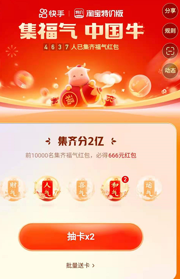 1、单张运气卡是没有用的,但是集福卡的活动运气卡是最难获得的,所以获得以后还是比较幸运的,用户需要集齐所有福气卡才能参与分红包的活动,所以是用来瓜分两亿现金红包的;