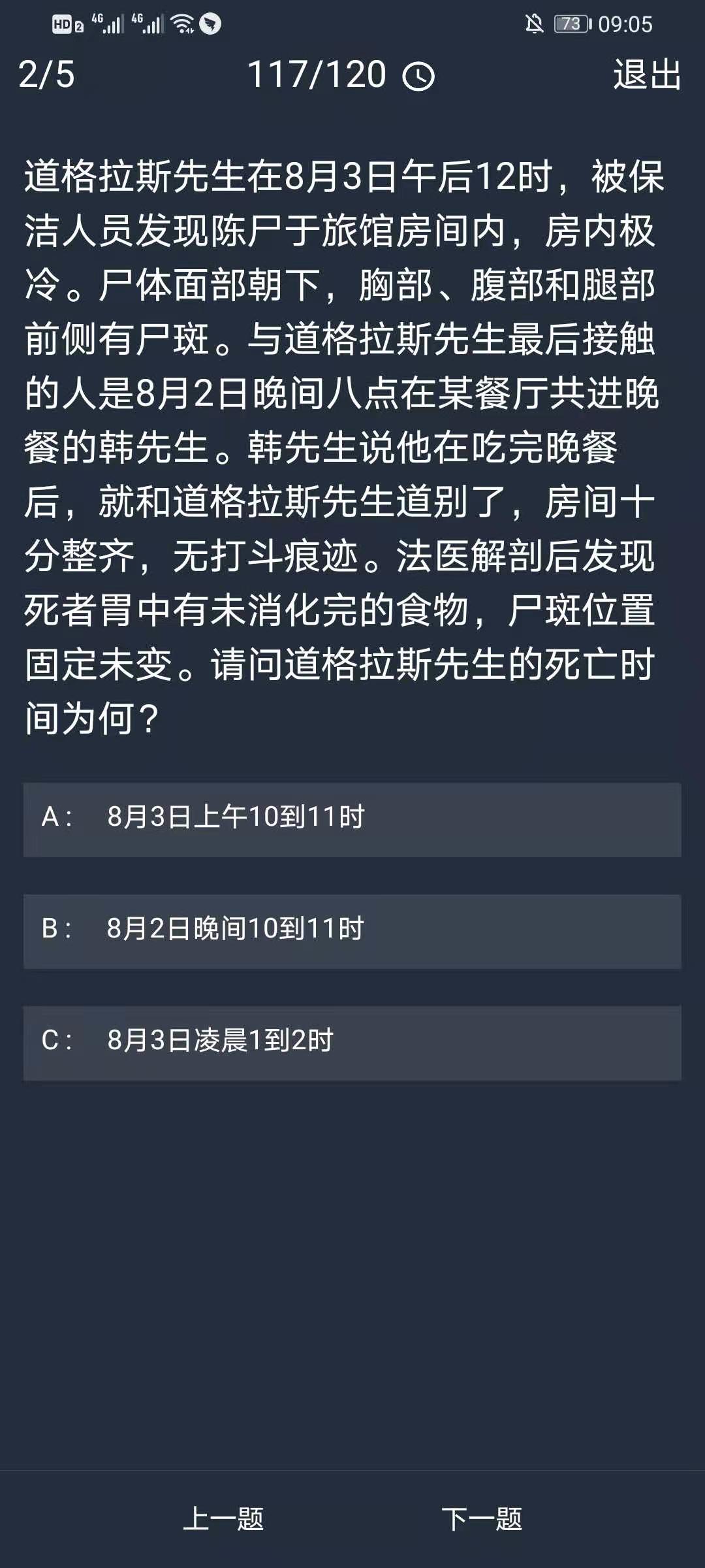 答案解析:道格拉斯先生死亡前两个小时内有进食才会在胃中仍有未消化的食物。尸斑通常在死后30分钟至两个小时浮现,在八至十二小时达到巅峰,六至八小时后尸斑渐次固定,尸体尸斑已固定,表示死亡时间已经超过八小时,故道格拉斯先生的死亡时间为8月2日晚间10至11时。注:尸斑的产生与温度无关,尸僵才与温度相关。故不需考虑温度的情形。