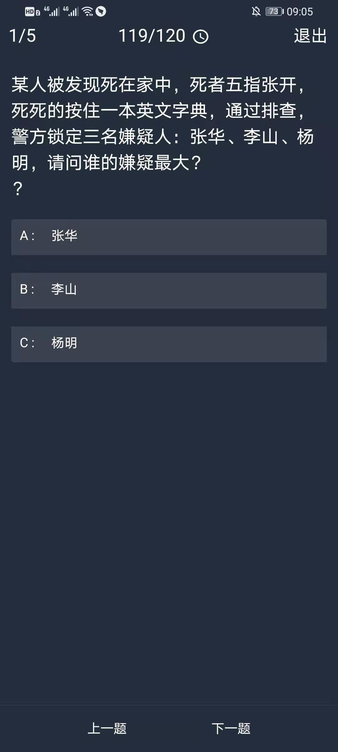 1、某人被发现死在家中,死者五指张开,死死的按住一本英文字典,通过排查,警方锁定三名嫌疑人:张华、李山、杨明,请问谁的嫌疑最大??