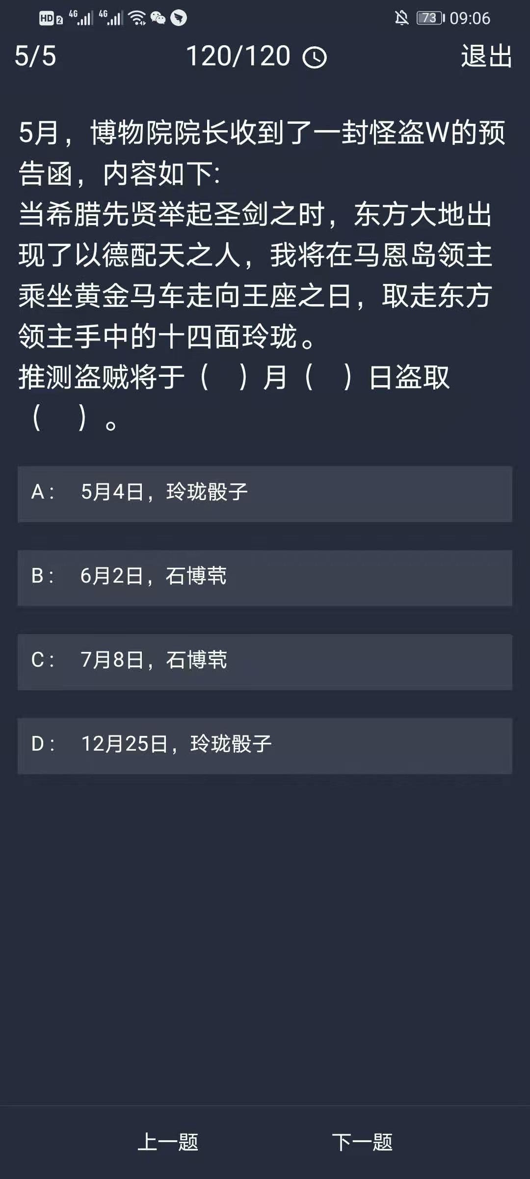 5、5月,博物院院长收到了一封怪盗W的预告函,内容如下:当希腊先贤举起圣剑之时,东方大地出现了以德配天之人,我将在马恩岛领主乘坐黄金马车走向王座之日,取走东方领主手中的十四面玲珑。推测盗贼将于()月()日盗取()。