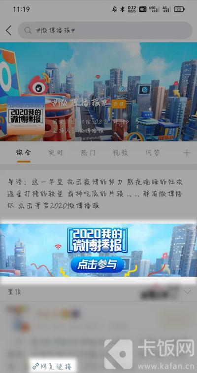2.搜索进入微博播报话题页面后,直接点击下方的横幅进入,或者点击网友微博中的网页链接进入;