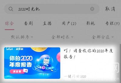 2.输入关键字【2020时光机】,点击搜索之后,在搜索结果中,点击【叮!请查收你的2020年度报告!】进入;