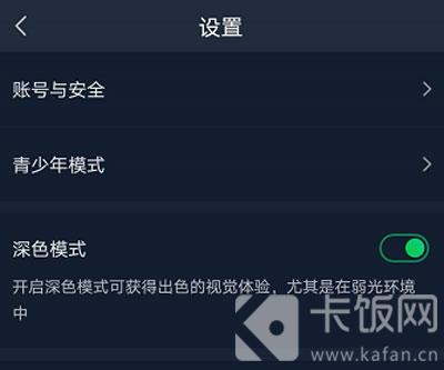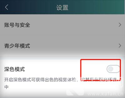 3.在设置页面,找到青少年模式下方的的【深色模式】,开启右侧的滑块;