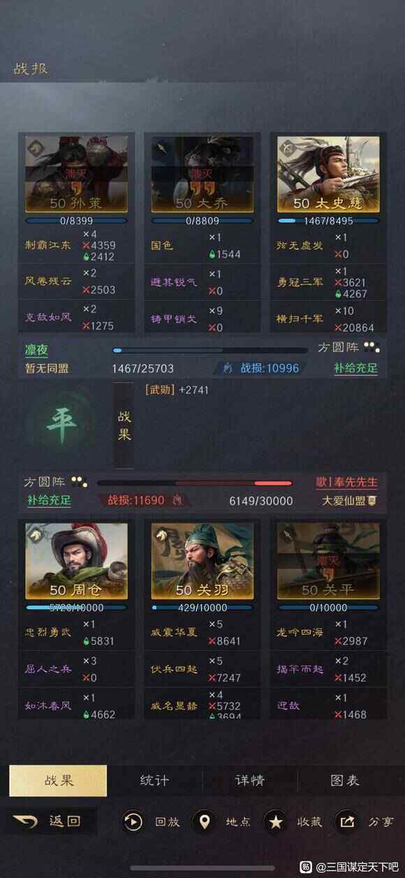 然后说孙策。这一对孙策有两个好处,吃了两个缘分,多了20点武力和统帅,更肉了,伤害更高了,回血也更多了。