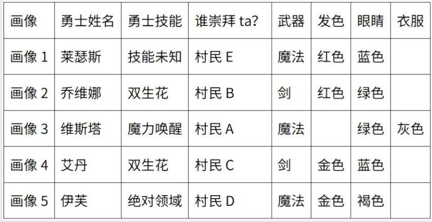 村民A 男 海达拉村的一个普通村民 【适合富有责任感的玩家】 村民B 女 海达拉村的一个普通村民【适合温柔可亲的玩家】 村民C 女 海达拉村的一个普通村民【适合活泼可爱的玩家】 村民D 男 海达拉村的一个普通村民【适合高冷的玩家】 村民E 女 海达拉村的一个普通村民【适合热情的玩家】 *村民38号在今天没有刷新过那么明天他可以使用两次刷新?错误× *村民穿着衣服死亡刷新之后会光着屁股刷新在祭坛?错误× *村民如果死在封闭空间内尸体就不会因为刷新消失这会导致同时存在两具尸体?错误× *如果村民在夜里23点触发了刷新即使天没亮他仍然可以在0点之后再次触发刷新?正确? *在排除外乡人的情况村中一旦发生谋杀事件凶手只可能是出题人?正确? *出题人可能利用他人进行作案但绝不会存在合谋的情况?正确? *出题人不会对死者的身体进行额外的毁坏和切割?正确? *莱瑟斯的技能是?技能未知 *乔维娜的技能是?双生花 *维斯塔的技能是?魔力唤醒 *艾丹的技能是?双生花 *伊芙的技能是?绝对领域