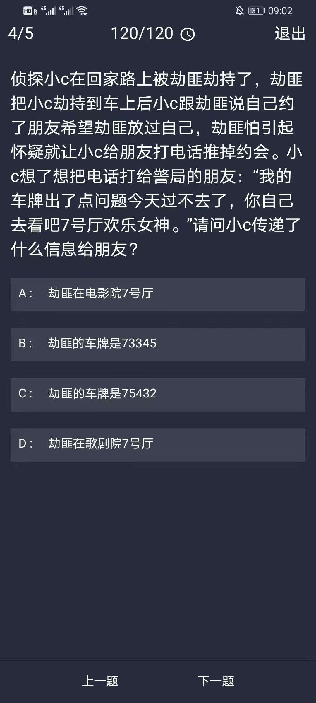 答案解析:小c提到了“车牌出了点问题”,欢乐女神是贝多芬的欢乐颂中的歌词,歌词的简谱是3345,7号厅的欢乐女神就是73345,所以小c向朋友传递了劫匪的车牌号是73345的消息。