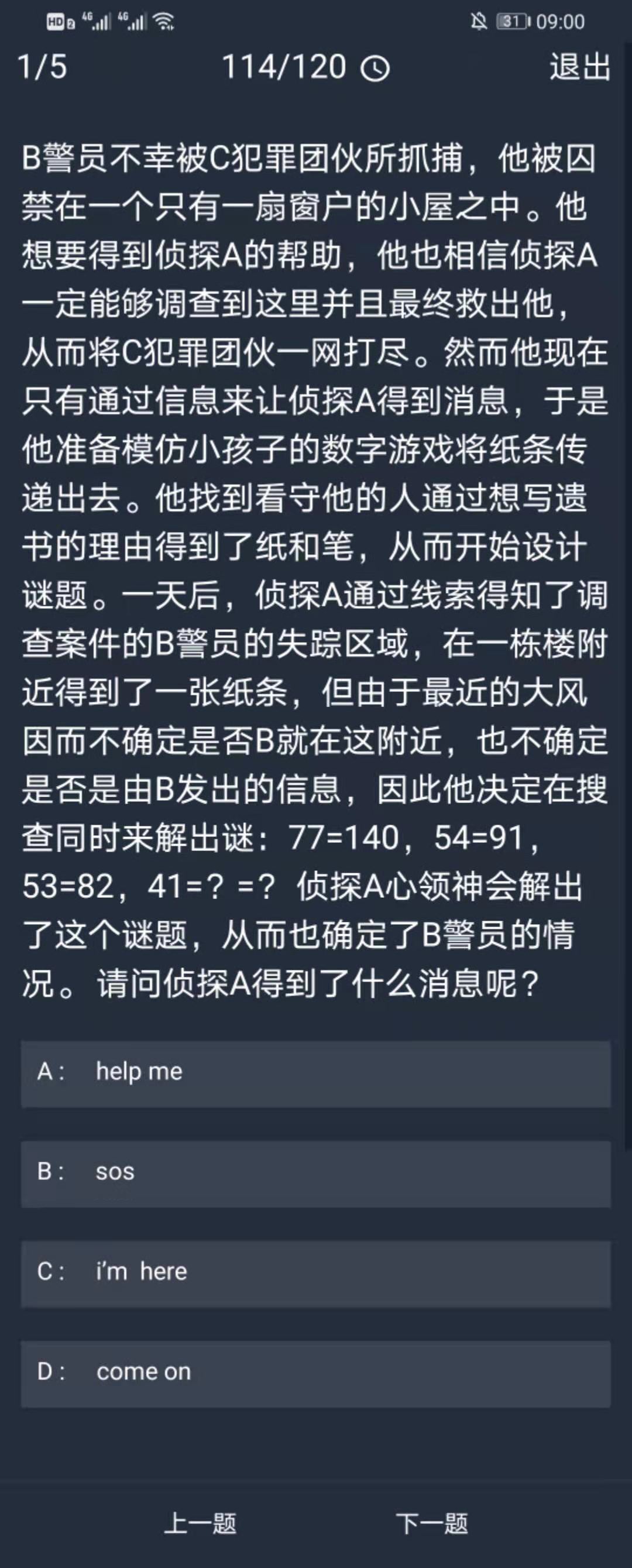 1、B警员不幸被C犯罪团伙所扒拥,他筱A禁在一个只有一扇窗户的小屋之中。他想要得到侦探A的帮助,他也相信侦探A一定能够调查到这里并且最终救出他,从而将C犯罪团伙一网打尽。然而他现在只有通过信息来让侦探A得到消息,于是他准备模仿小孩子的数字游戏将纸条传递出去。他找到看守他的人通过想与项书的理由得到了纸和笔,从而开始设计谜题。一天后,侦探A通过线索得知了调查案件的B警员的失踪区域,在一栋楼附近得到了一张纸条,但由于最近的大风因而不确定是否B就在这附近,也不确定是否是由B发出的信息,因此他决定在搜查同时来解出谜:77=140,54=91,53=82,41=?=?侦探A心资tL明国了这个谜题,从而也确定了B警员的情况。请问侦探A得到了什么消息呢?