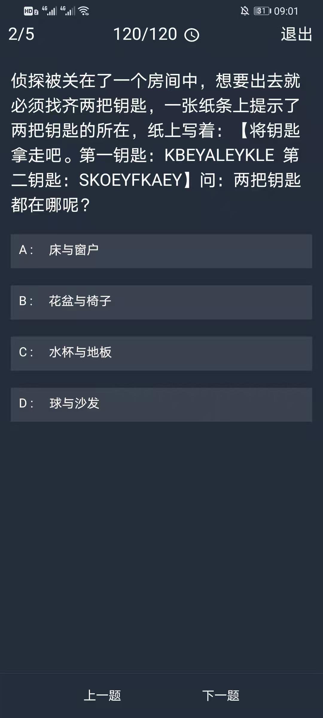2、侦探被关在了一个房间中,想要出去就必须找齐两把钥匙,一张纸条上提示了两把钥匙的所在,纸上写着:【将钥匙拿走吧。第一钥匙:KBEYALEYKLE 第二钥匙:SKOEYFKAEY】问:两把钥匙都在哪呢?
