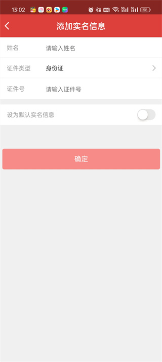 4、最后点击过后在添加实名信息的页面中我们输入姓名和证件号后点击【确定】即可;