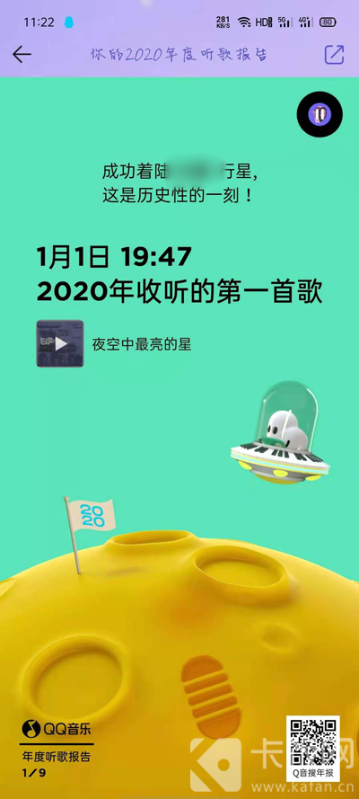 2.随后进入你的2020年度听歌报告页面后,首先看到的是2020年收听到的第一首歌;