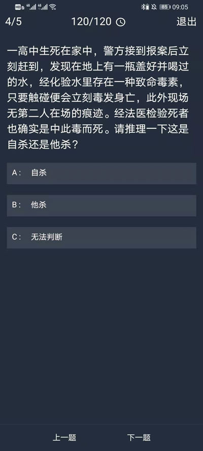 4、一高中生死在家中,警方接到报案后立刻赶到,发现在地上有一瓶盖好并喝过的水,经化验水里存在一种致命毒素,只要触碰便会立刻毒发身亡,此外现场无第二人在场的痕迹。经法医检验死者也确实是中此毒而死。请推理一下这是自杀还是他杀?