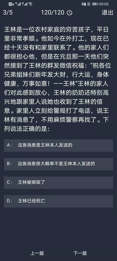 答案解析:王林是一位农村出来的孩子,很注重辈分也很孝顺。在他的群发微信中称呼所有人为"兄弟姐妹”,但是王林的奶奶也收到了这条信息,所以这个称呼是很不合适的。因此这条消息大概率不是王林本人发送的。王林死亡与被绑架两项属于过度推断。