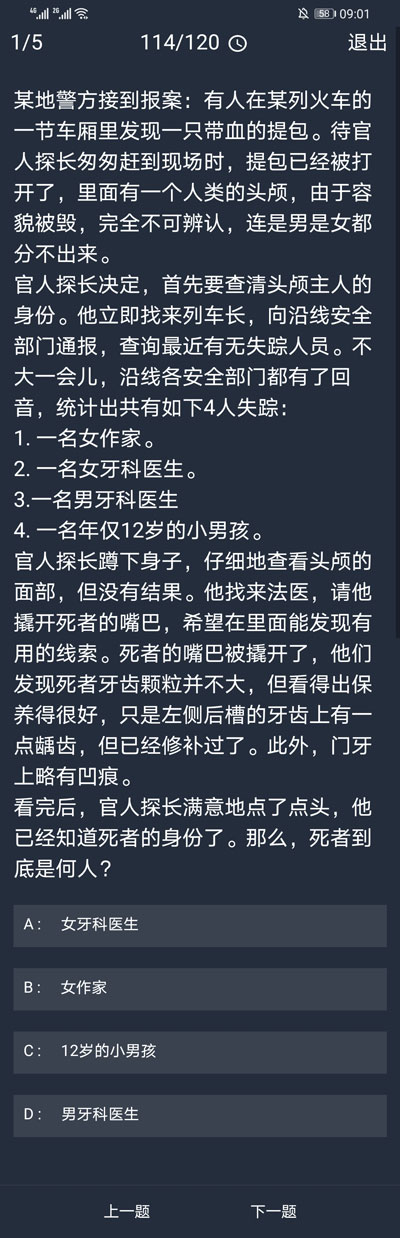1、某地警方接到报案:有人在某列火年的一节车厢里发现一只带血的提包。待官人探长匆匆赶到现场时,,提包已经被打开了,里面有一个人类的头颅,由于容貌被毁,完全不可辨认,连是男是女都分不出来。官人探长决定,首先要查清头颅主人的身份。他立即找来列车长,向沿线安全部门通报,查询最近有无失踪人员。不大一会儿,沿线各安全部门都有了回音,统计出共有如下4人失踪:1.一名女作家。2.一名女牙科医生。3.一名男牙科医生4.一名年仅12岁的小男孩。官人探长蹲下身子,仔细地查看头颅的面部,但没有结果。他找来法医,请他撬开死者的嘴巴,希望在里面能发现有用的线索。死者的嘴巴被撬开了,他们发现死者牙齿颗粒并不大,但看得出保养得很好,只是左侧后槽的牙齿上有一点龋齿,但已经修补过了。此外,门牙上略有凹痕。看完后,官人探长满意地点了点头,他已经知道死者的身份了。那么,死者到底是何人?