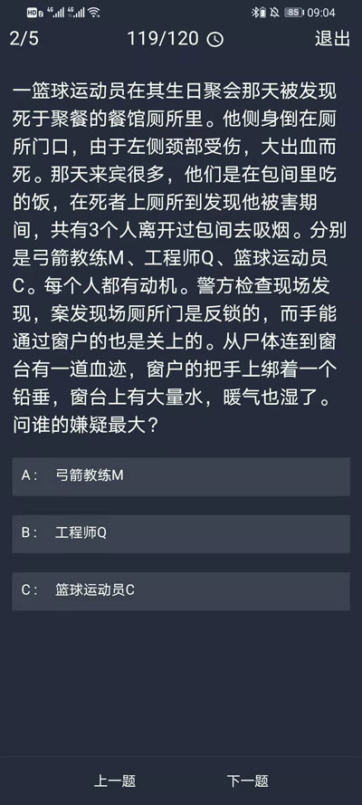 2、一篮球运动员在其生日聚会那天被发现死于聚餐的餐馆厕所里。他侧身倒在厕所门口,由于左侧颈部受伤,大出血而死。那天来宾很多,他们是在包间里吃的饭,在死者上厕所到发现他被害期间,共有3个人离开过包间去吸烟。分别是弓箭教练M、工程师Q、篮球运动员C。每个人都有动机。警方检查现场发现,案发现场厕所门是反锁的,而手能通过窗户的也是关上的。从尸体连到窗台有一道血迹,窗户的把手上绑着一个铅垂,窗台上有大量水,暖气也湿了。问谁的嫌疑最大?
