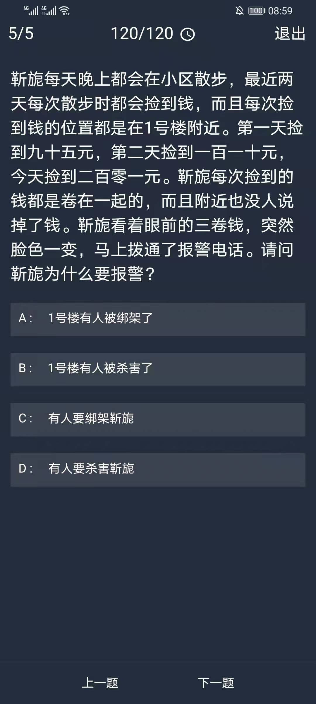 正确答案:A(一号楼有人被绑架了)