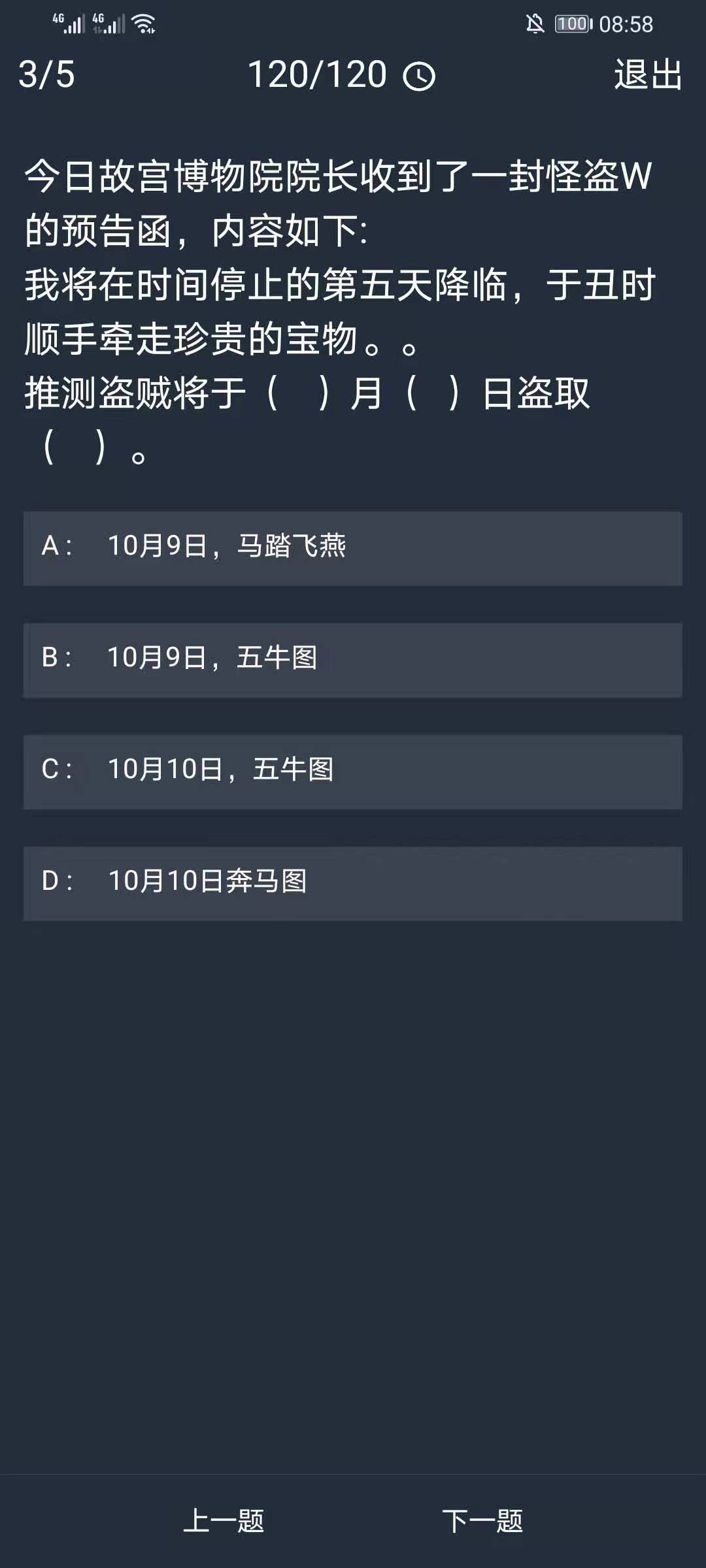 3、今日故宫博物院院长收到了一封怪盗W的预告函,内容如下:我将在时间停止的第五天降临,于丑时顺手牵走珍贵的宝物。。推测盗贼将于()月()日盗取()。
