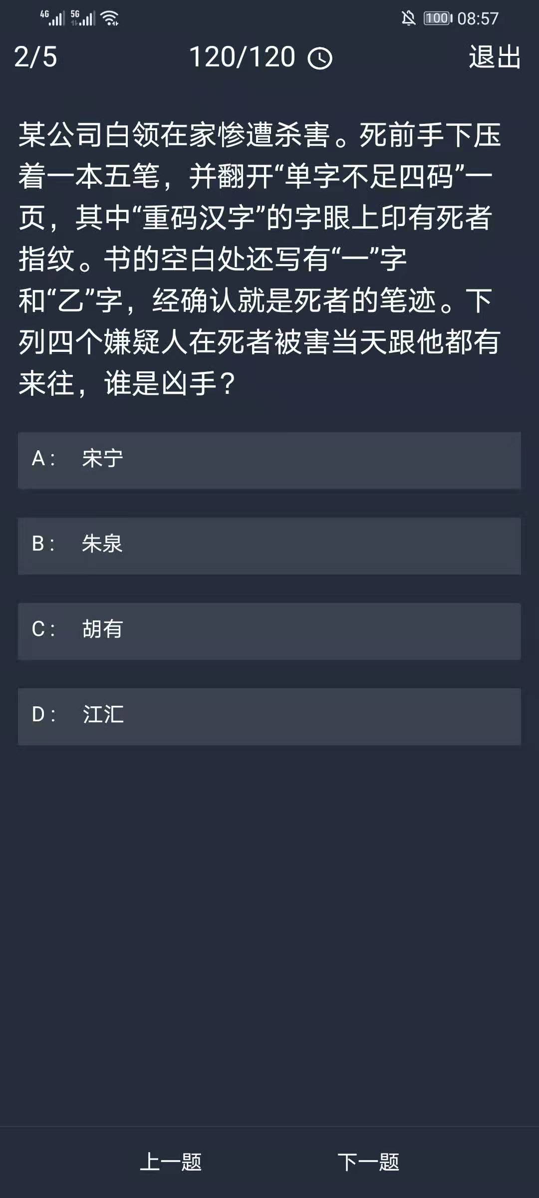 答案解析:死者在重码汉字的字眼上印有指纹,可以初步推断凶手的姓名是个重码汉字。在五笔里:宋和宁的字根都是PS,胡和有的字根都是DE,朱和泉的字根都是Rl,江和汇的字根都是IA。上述三组汉字如果不添加末位笔划的代码,代码是一样的,不能区分开,这就是五笔所说的重码汉字。书中有些有”—"和“乙"字,可以进一步推断姓名的末笔分别是横和折,只有江汇这个名字符合此条件,故凶手是江汇。