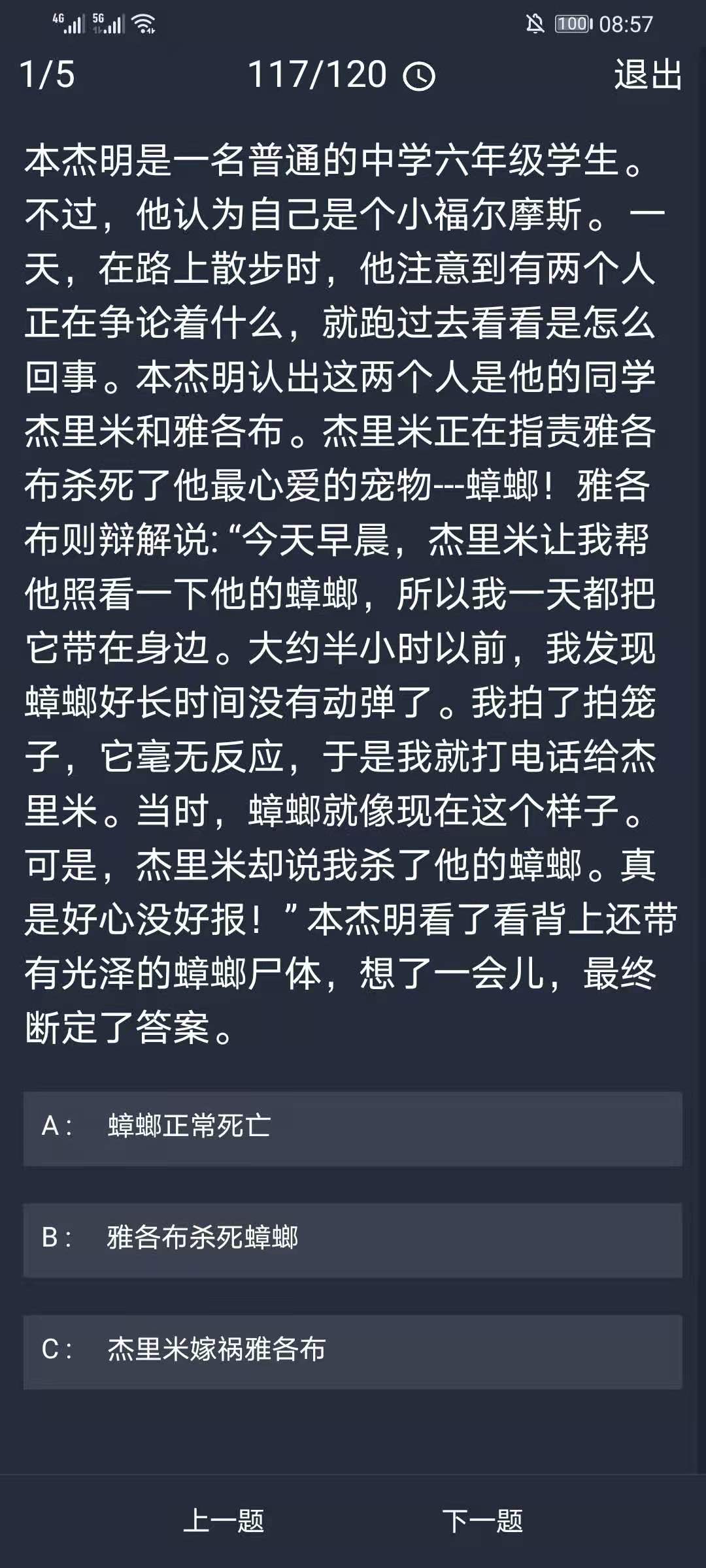 答案解析:蜻螂在自然死亡时是肚皮朝上的。可是,本杰明看到的蜻螂的尸体却是背朝上的。可惜雅各布懂的昆虫学知识太少,结果被本杰明看出了破绽。