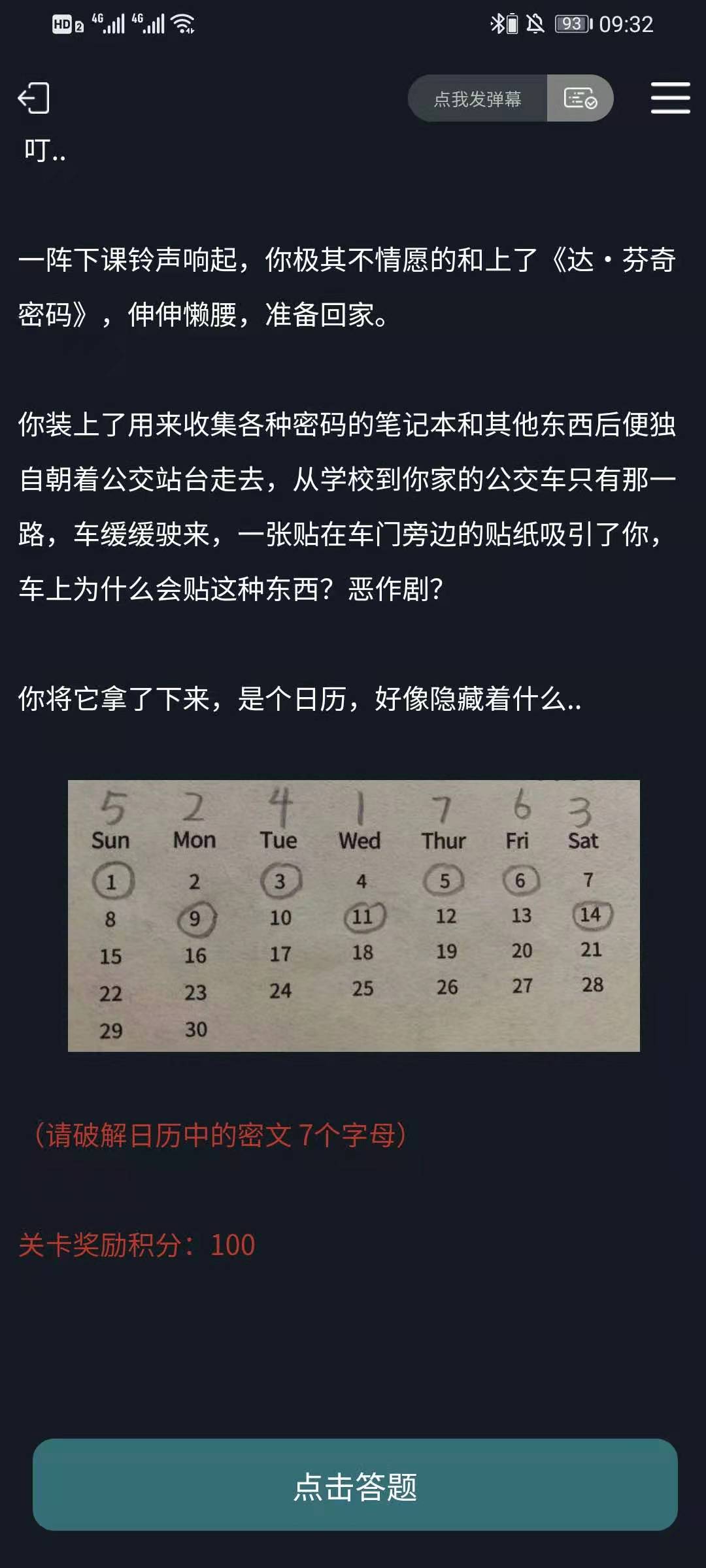 一阵下课铃声响起,你极其不情愿的和上了《达·芬奇密码》,伸伸懒腰,准备回家。你装上了用来收集各种密码的笔记本和其他东西后便独自朝着公交站台走去,从学校到你家的公交车只有那一路,车缓缓驶来,一张贴在车门旁边的贴纸吸引了你,车上为什么会贴这种东西?恶作剧?你将它拿了下来,是个日历,好像隐藏着什么..