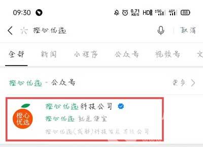1.打开手机上的微信,搜索【橙心优选】,然后找到搜索结果中的【橙心优选科技公司】公众号进入;