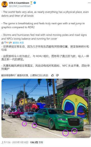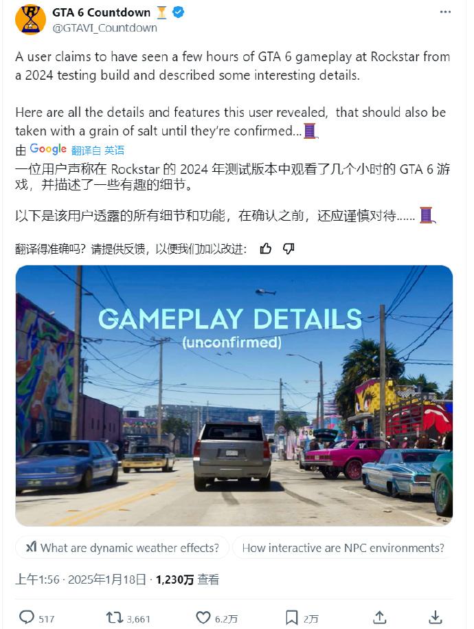 在前些日子就有消息称《GTA6》将加入全新的“高级环境破坏功能”,近日又有媒体称一位看过几小时《GTA6》测试版本的玩家爆料游戏将包含动态天气系统,目的是提高玩家的沉浸式体验感。