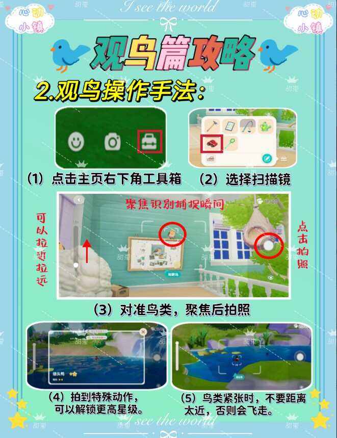 (3)拍到特殊动作,可以解锁更高星级的卡,爱好等级越高,越容易拍到。值得注意的是,观测时不要距离太近,鸟会紧张飞走,适当离远点,拉近镜头即可!