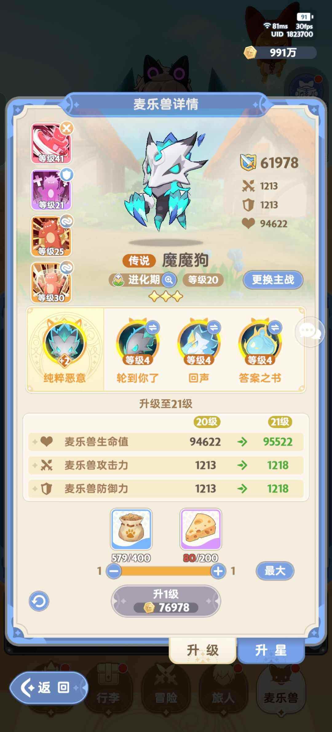 重点细节二:宠物招式平均等级不要升到25级,达到21级就够了,因为平均达到25级,魔魔狗觉醒CD会减少5秒,看似触发频率变高了,