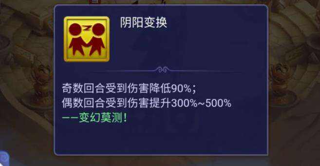 1、阴阳变换:奇数回合受到的物法伤害减少90%;偶数回合受到的物法伤害增加300%~500%;