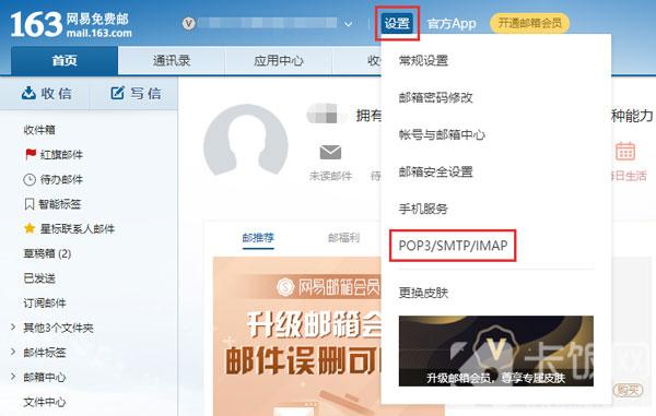 2、进入自己的163邮箱账号之后,点击上方的【设置】,然后在弹出的选项中,选择【POP3/SMTP/IMAP】;