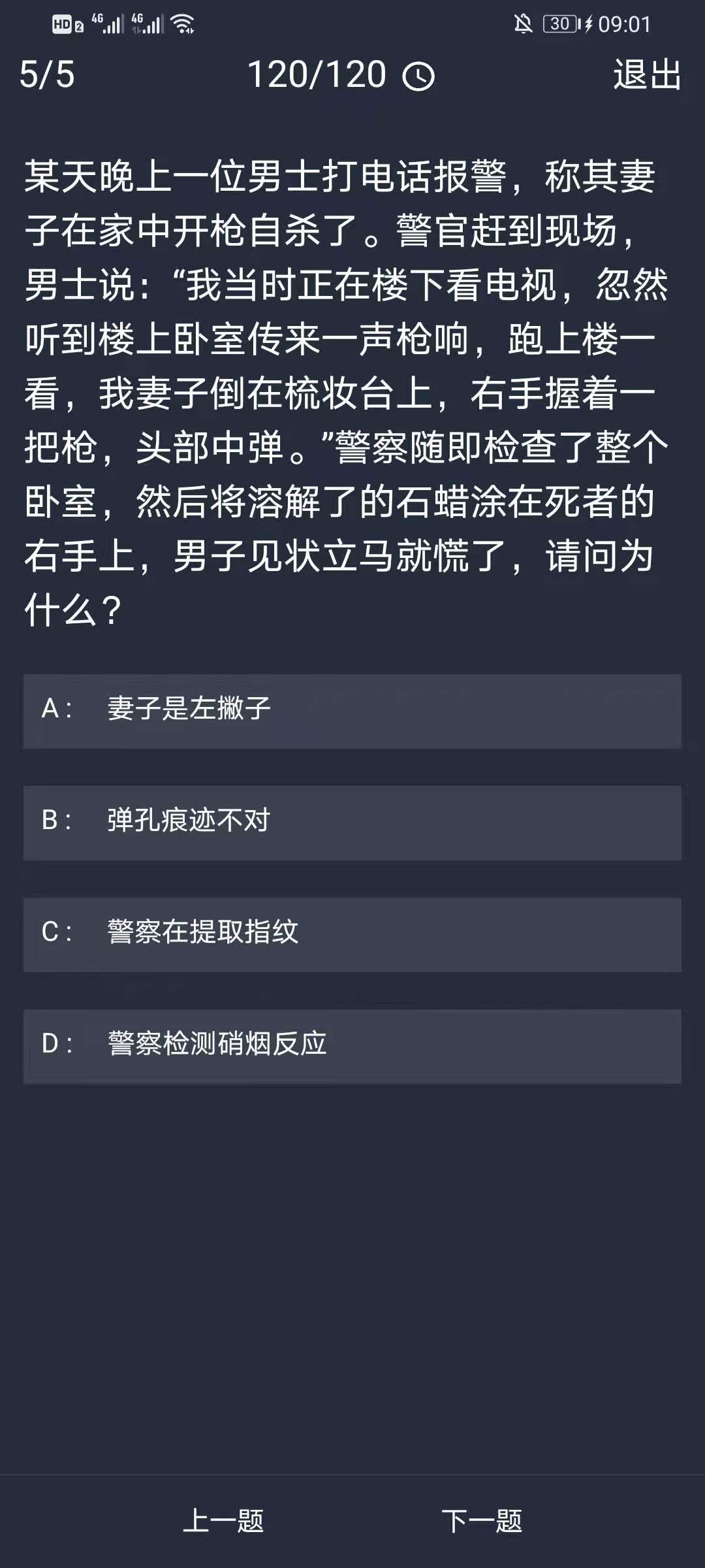 5、某天晚上一位男士打电话报警,称其妻子在家中开枪自杀了。警官赶到现场,男士说:“我当时正在楼下看电视,忽然听到楼上卧室传来一声枪响,跑上楼一看,我妻子倒在梳妆台上,右手握着一把枪,头部中弹。"警察随即检查了整个卧室,然后将溶解了的石蜡涂在死者的右手上,男子见状立马就慌了,请问为什么?