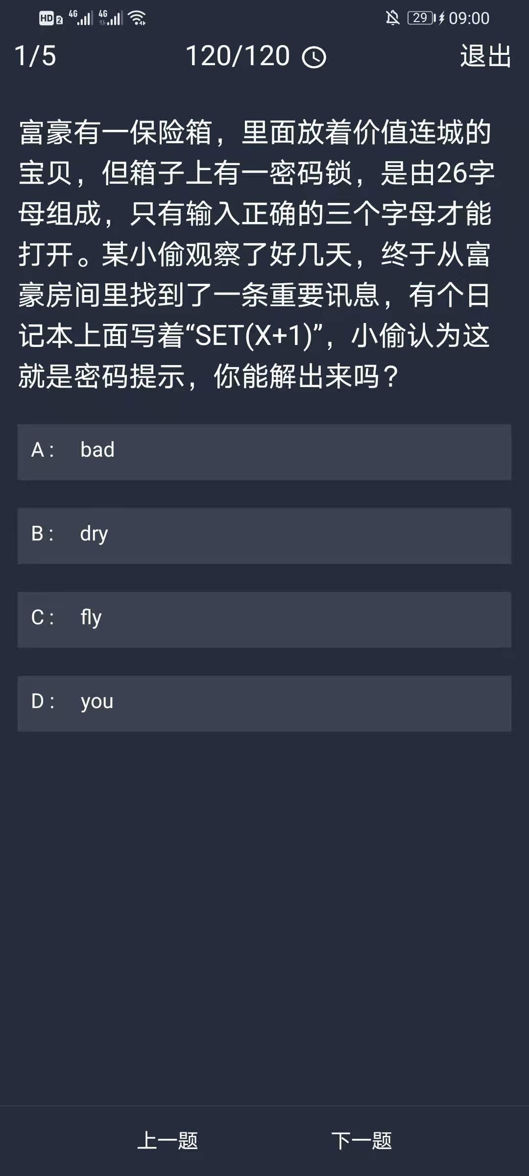 答案解析:在键盘上找到SET三个字母,它们的横坐标(x)加上1,即向右移一格,得到密码dry 。