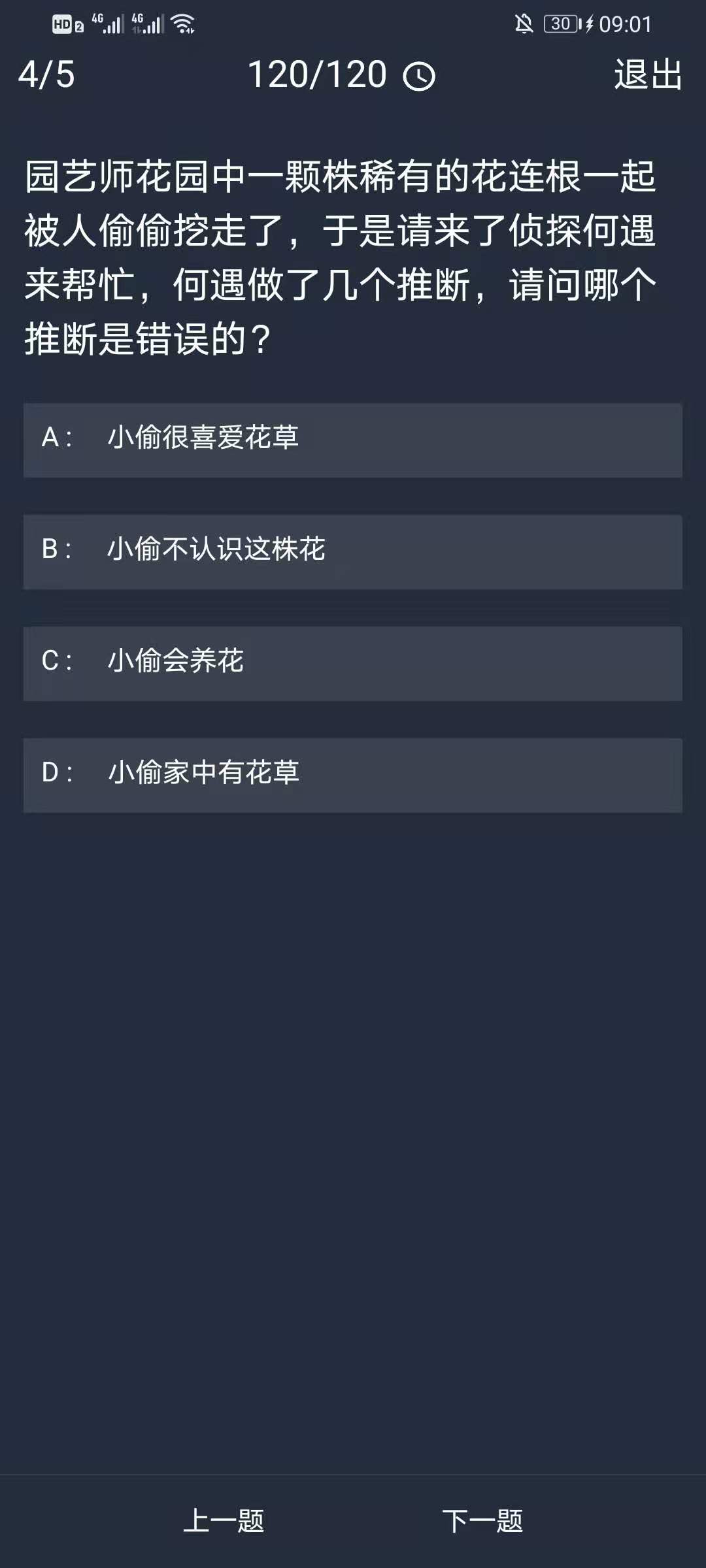 4、园艺师花园中一颗株稀有的花连根一起被人偷偷挖走了,于是请来了侦探何遇来帮忙,何遇做了几个推断,请问哪个推断是错误的?
