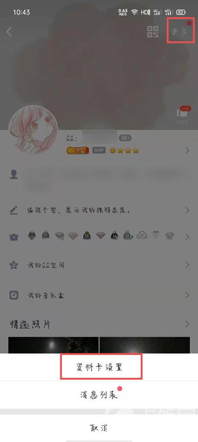 3.随后,点击右上角的【更多】按钮,然后在弹出的选项中,选择【资料卡设置】;