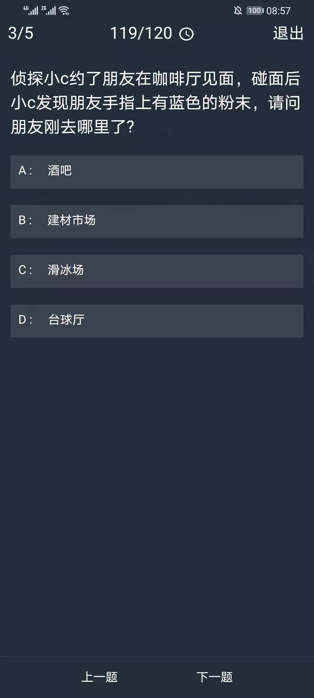 答案解析:台球厅的防滑粉多是蓝色的而且打球过程中很容易沾到手指上。
