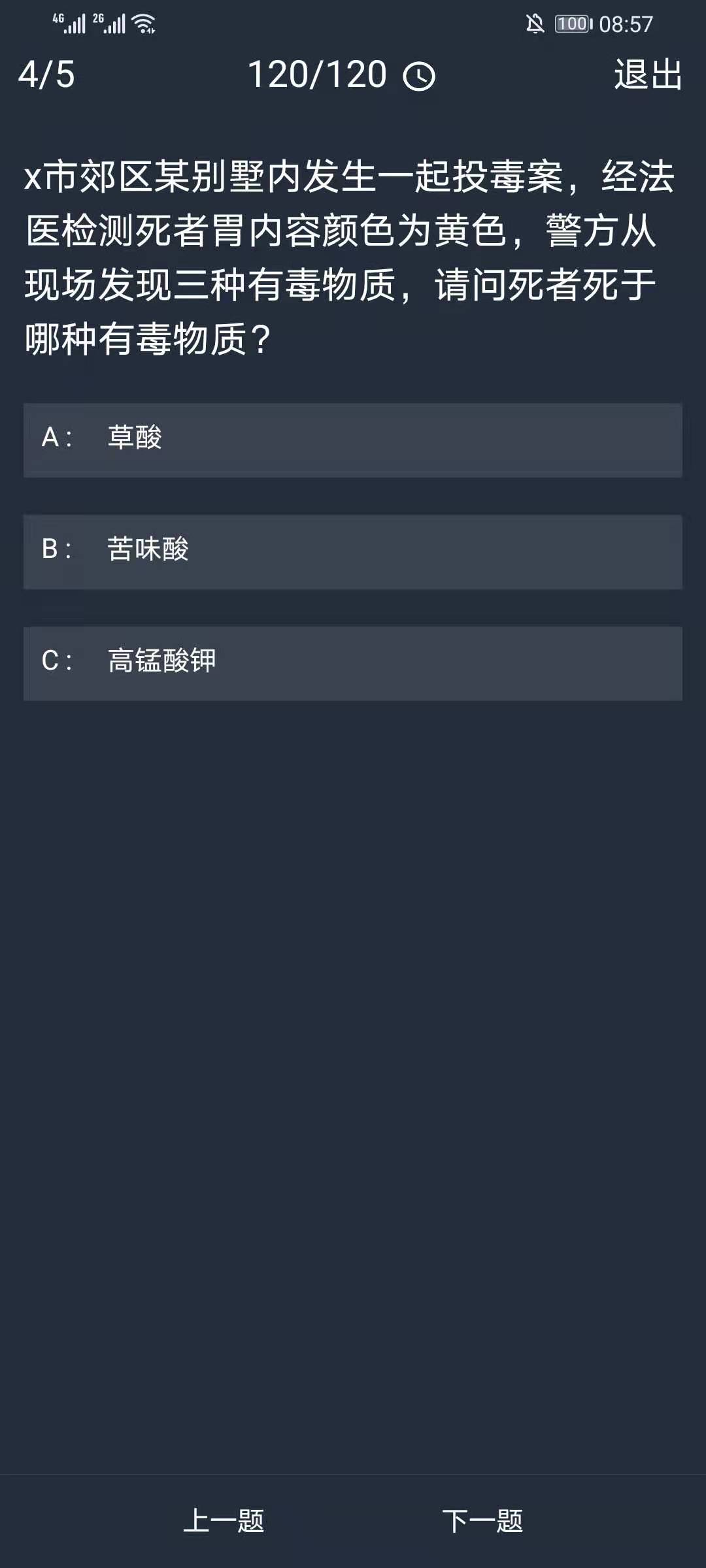 4、x市郊区某别墅内发生一起投毒案,经法医检测死者胃内容颜色为黄色,警方从现场发现三种有毒物质,请问死者死于哪种有毒物质?
