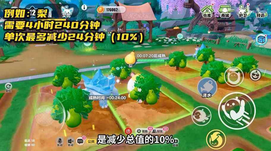 植物每次浇水减时长的上限是减少总值的10% ,当浇完一次水,再次经过植物正常成熟时间的一半之后,第二次浇水,又能减少植物10%的生长时间,等到最后成熟之前再浇最后一次水,还能减少5%。这样算下来,一次浇3次水,最多就能减少植物25%的生长时间,这就是最快的种植方法了!