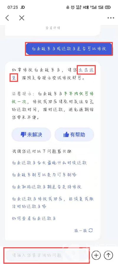 5、然后,点击输入框,输入【白条账单日或还款日是否可以修改】,发送后会得到修改的方法;