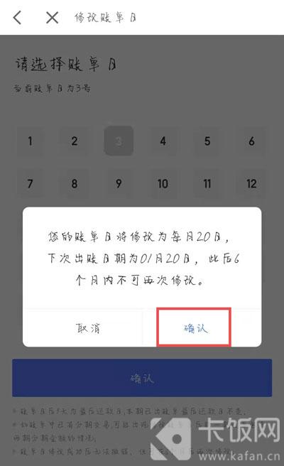 7、选择好账单日之后,点击下方的【确定】按钮,确定选择该账单为账单日;