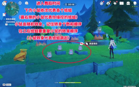 下方小鼠依次代表各个纸蛙(最右侧的小鼠代表你操控的纸蛙),小鼠会随机转身,记住转身个数和顺序,在之后纸蛙要重复小鼠的转身顺序(小鼠转身代表纸蛙跳起)。