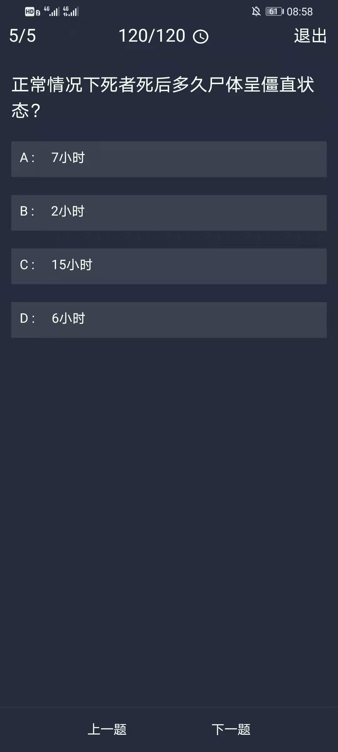 5、正常情况下死者死后多久尸体呈僵直状态?